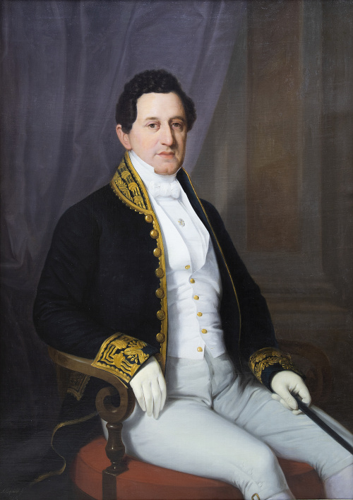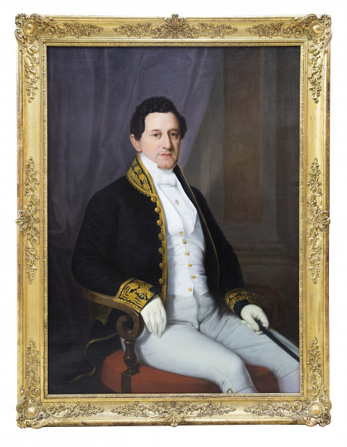 Excepcional retrato inédito de Antonio Maria Esquivel conservada hasta ahora en una colección particular. En un interior, con un cortinaje púrpura de fondo, el pintor nos sitúa a un joven diplomático vestido con levita bordada en amarillo los cuellos y los puños, mirando al espectador de manera elegante. Se sienta sobre un sillón forrado en terciopelo rojo. En su mano derecha porta un bastón. Tanto con el alfiler, como los botones en amarillo simulando oro, Esquivel, realza la elegancia y el estatus social del retratado. Destacamos los maravillosos tonos blancos del chaleco y la camisa.