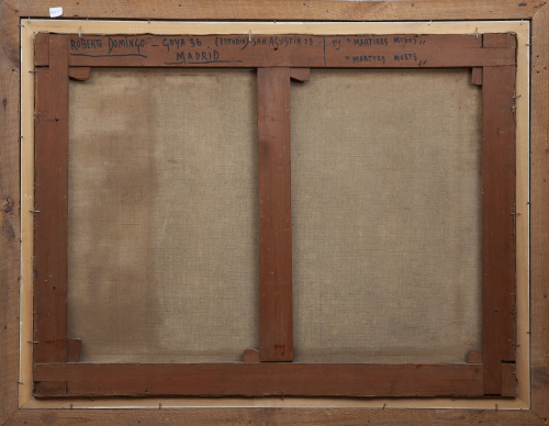 Firmado, titulado, localizado e incrito en el bastidor: ROBERTO DOMINGO-GOYA 36. (ESTUDIO) SAN AGUSTÍN, 13 ] Nº1 "MÁRTIRES MODOS"/MADRID ] "MARTYRS MUETS"