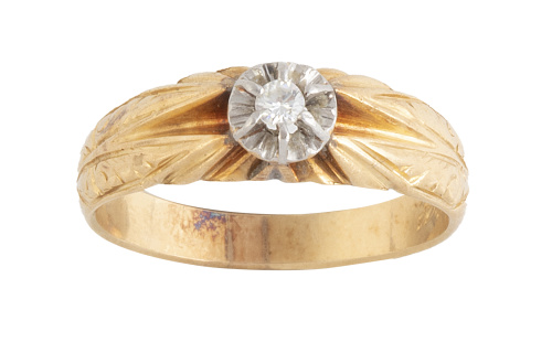 Sortija solitario de brillante años 30 en montura de oro grabada