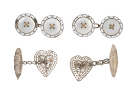 117. Gemelos romboidales en oro bajo con decoración grabada y zafiros blancos