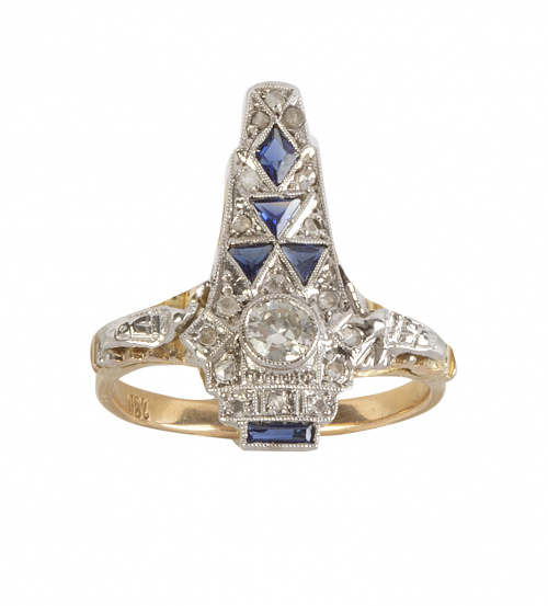 Home / SUBASTA JUNIO 2023 / Sortija lanzadera asimétrica Art-Decó de brillantes y zafir