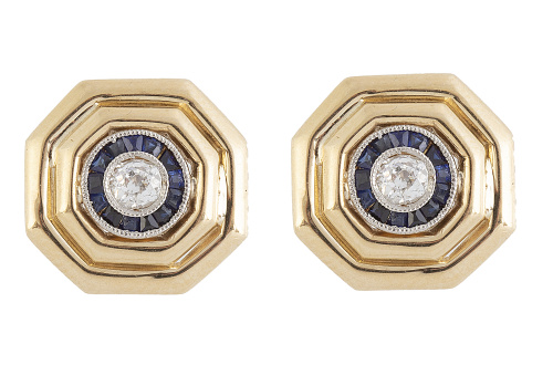 151. Pendientes octogonales Art-Decó con brillante central en chatón orlado de zafiros