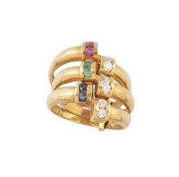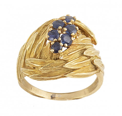 Sortija años 50 con diseño de nido de hojitas grabadas coronado por séis zafiros engastados en garra
