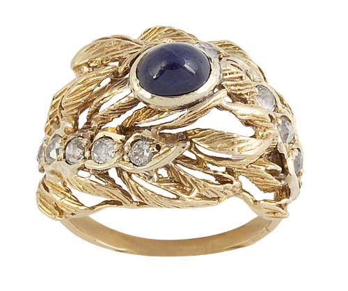 192. Sortija bombée años 30 de hojas grabadas adornadas con brillantes de talla antigua, con cabujón de zafiro central