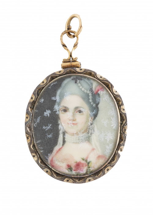 2. Colgante S. XVIII con miniatura de dama con collar de perlas y adornos florales