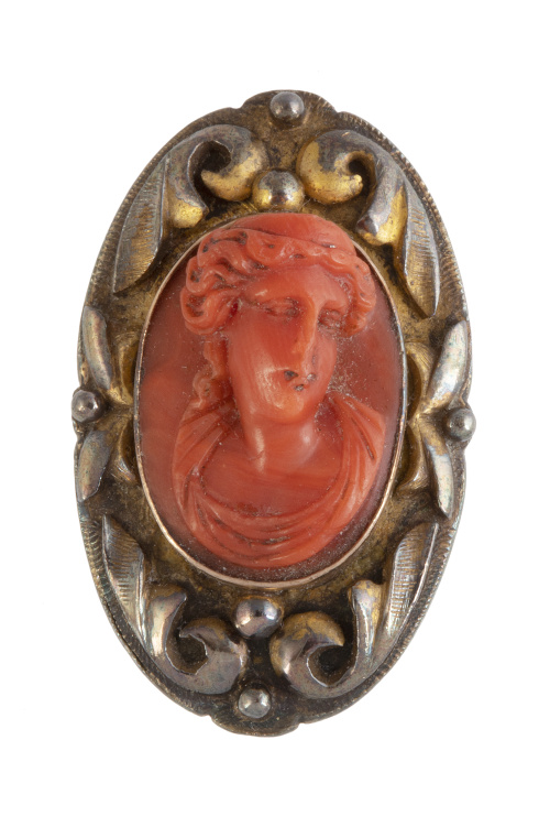 25. Sortija lanzadera de ff. S. XVIIl con gran camafeo de coral representando dama clásica, en marco de hojas labradas en relieve