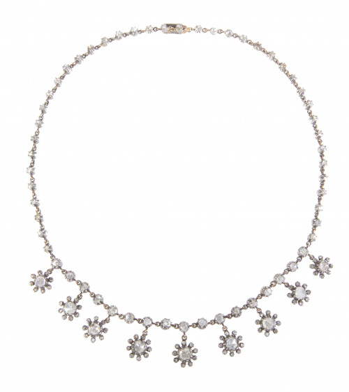 Collar rivière de diamantes de talla rosa de ff. S. XVIII -pp. S. XIX, con nueve centros de rosetones de diamantes en forma de flor colgantes