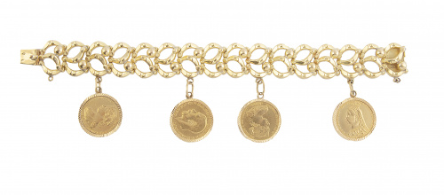 Home / SUBASTA JUNIO 2023 / Brazalete articulado con cuatro monedas colgantes y piezas