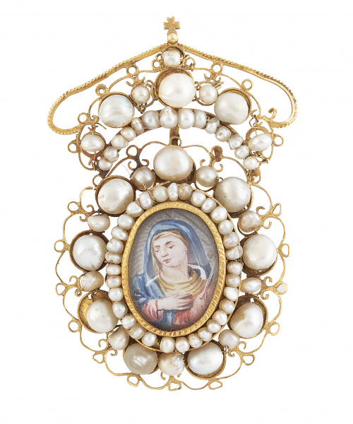 27. Colgante relicario S. XIX en filigrana de oro y perlas naturales de aljófar, con miniatura de Virgen
