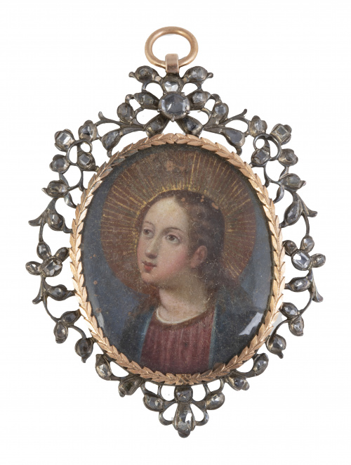 3. Colgante S. XVIII con miniatura en cobre de Virgen de la Asunción del S. XVII, en marco de diamantes con formas vegetales