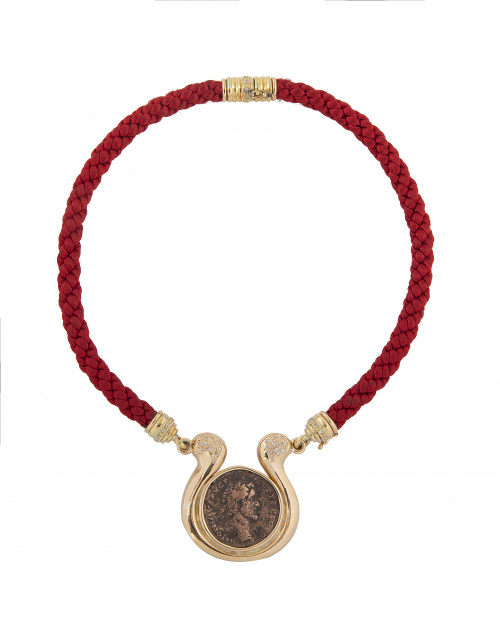 Collar con centro de moneda romana en marco de oro a modo de lira rematada con brillantes, y cordón de seda con remates de cilindros de oro gallonado y brillantes; Intercambiable