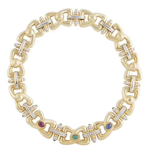 308. Gargantilla articulada de oro con once centros de piezas con diseño de lazo, y en el frente tres cabuchones de esmeralda, rubí y zafiro combinados con bandas de brillantes
