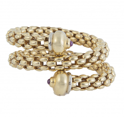 328. Brazalete en espiral de malla calada tubular flexible, rematada con cabuchones de rubíes en frente abierto