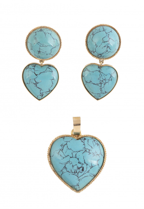 330. Conjunto de pendientes y colgante de turquesa con marcos de cordoncillo de oro