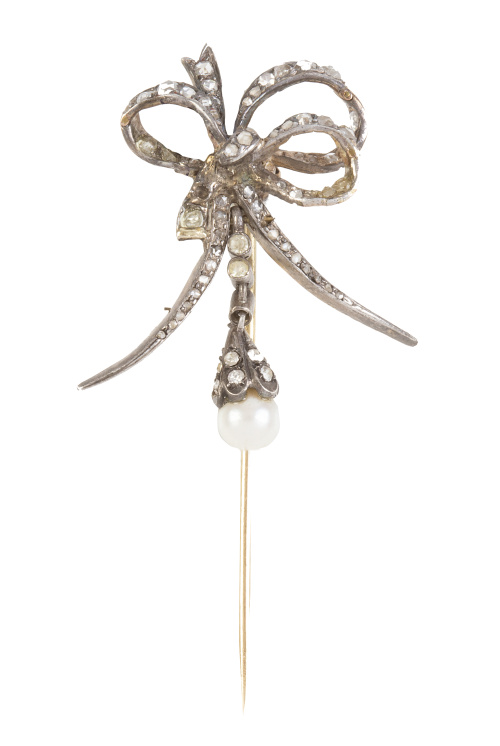 34. Broche alfiler de diamantes isabelino en diseño de lazo con perla colgante