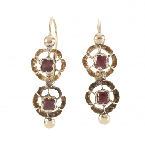 35. Pendientes largos S. XIX con dos flores adornadas con granates