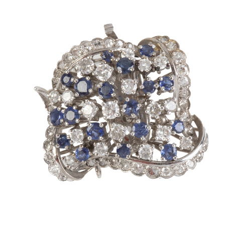 Home / SUBASTA JUNIO 2023 / Cierre de collar de brillantes y zafiros, con perfil sinuos