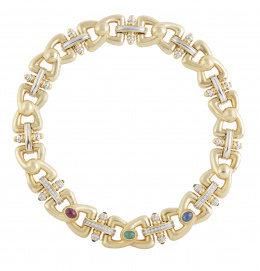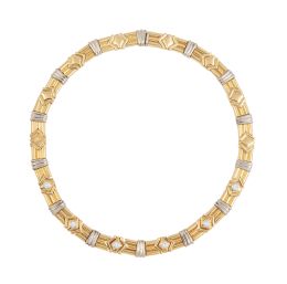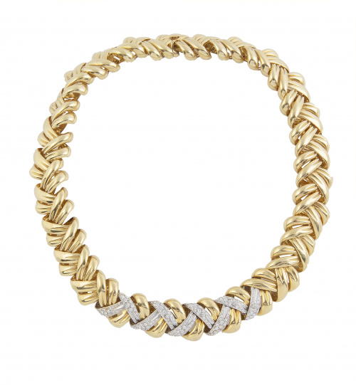389. Collar trenzado con dobles bandas gallonadas componiedo cada giro de la trenza, con nueve bandas de pavé de brillantes en el frente