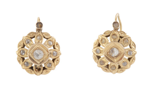 Pendientes flor circular de pp. S. XX con zafiros blancos y decoración calada