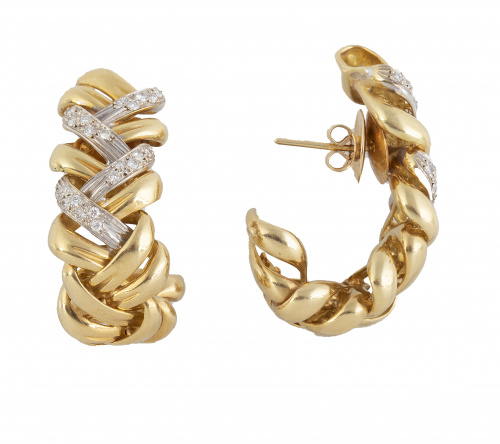 390. Pendientes con diseño de dobles bandas gallonadas trenzadas, con cuatro de las bandas decoradas con pavé de brillantes