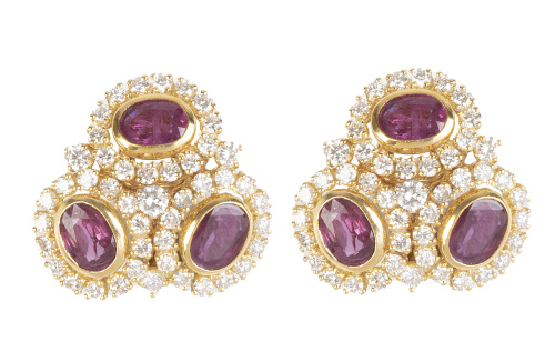 392. Pendientes de rubíes y brillantes con tres rosetones de rubíes ovales orlados de brillantes, componiendo trébol