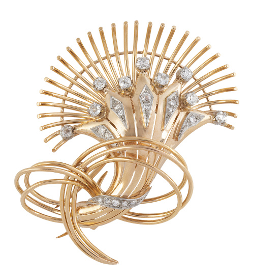 394. Broche chevalier años 50 de brillantes con diseño de flor exótica estilizada, rematada con estambres de hilo