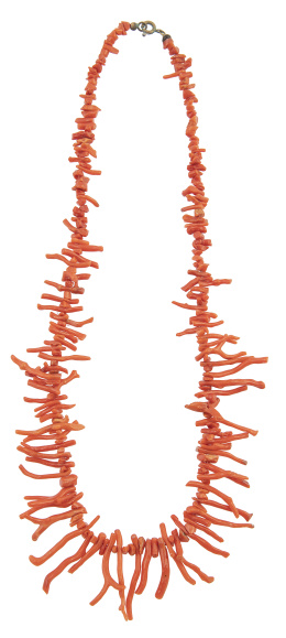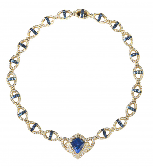 Con gargantilla formada por 20 centros ovalados de brillantes atravesados por bandas de zafiros calibrados, y articulados entre sí por arcos de brillantes.