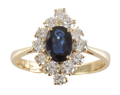 Sortija rosetón con zafiro oval central de 0,80 ct aprox rodeado de brillantes que forman marco ojival