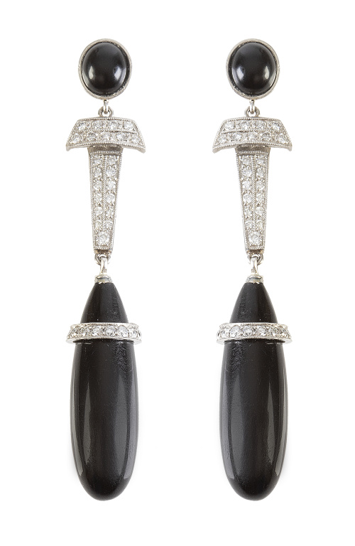 409. Pendientes largos estilo Art-Decó con ónix y brillantes en diseño geométrico con perillas de ónix colgantes