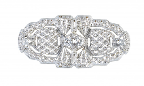 Broche placa de brillantes años 30 con decoración calada, y cuajada de diamantes con dos brillantes centrales engastados en garras elevadas