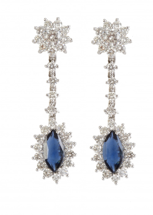 425. Pendientes largos de zafiros talla navette orlados de brillantes que pende de rosetón y línea articulada de brillantes