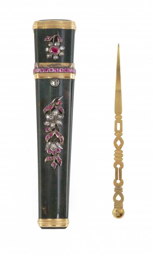 Estuche de ff. S. XVIII de jaspe y oro con forma prismática estilizada, con decoración vegetal de diamantes y rubíes