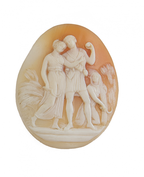 Camafeo tallado en concha bicolor S. XIX con escena clásica de dama, caballero y figura cosechando trigo