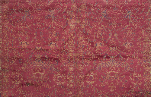 509. Fragmento de terciopelo con águilas bicéfalas coronadas en granate, y bordado en hilos amarillos y azules de influencia árabe.