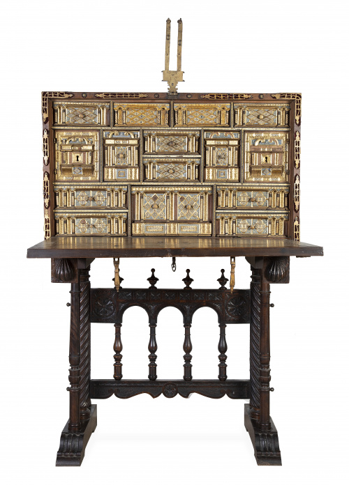 Escritorio de madera de nogal, madera tallada, estucada, dorada y columnillas de hueso policromado.