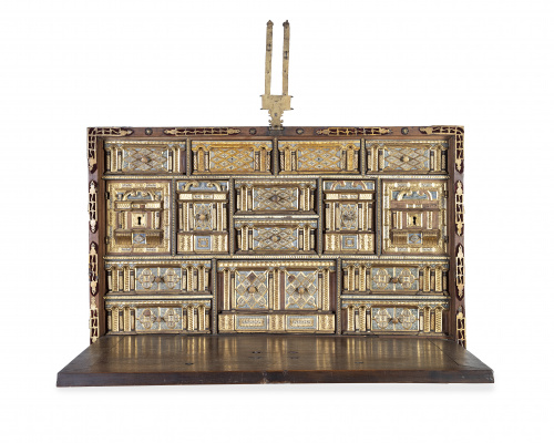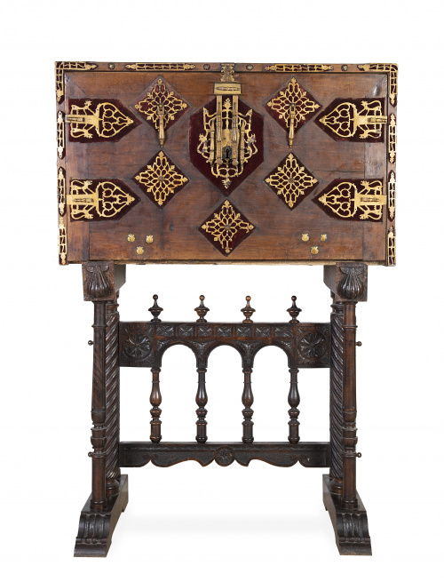 En la parte superior cuatro cajones que siguen a dos puertas y dos capillas talladas que flanquean dos cajones, seguidos de dos cajones horizonatles y dos verticales. Decorados con semicírculos que forman pétalos y elementos geométricos romboidales con flores. En el exterior con tiradores, cerradura, cantoneras y pestillos de hierro dorado, sobre terciopelo. Apoya sobre pies de puente de época posterior. Presenta algunas faltas.
