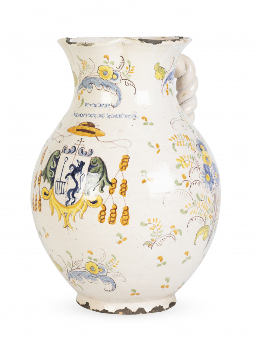 521. Jarro de asa torsa de cerámica esmaltada, con el escudo de la orden Jerónima del Monasterio de San Lorenzo del Escorial