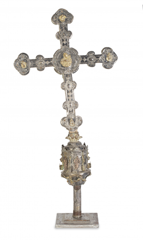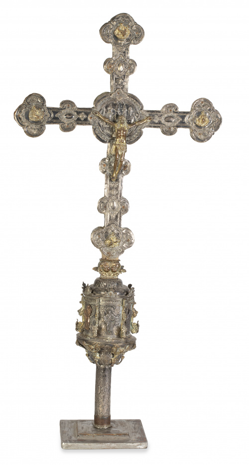 523. Cruz procesional con alma de madera, de plata en su color y aplicaciones de bronce dorado. Con marcas DIO/RMZ.