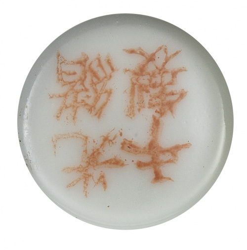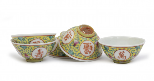 Juego de cinco tacitas de porcelana esmaltada en amarillo y carácteres en cartelas.
