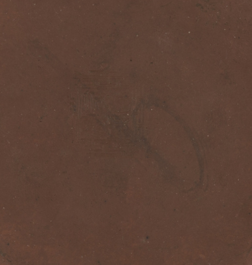 Tetera en barro, rematada en la tapa por una quimera. Marca incisa en la base.