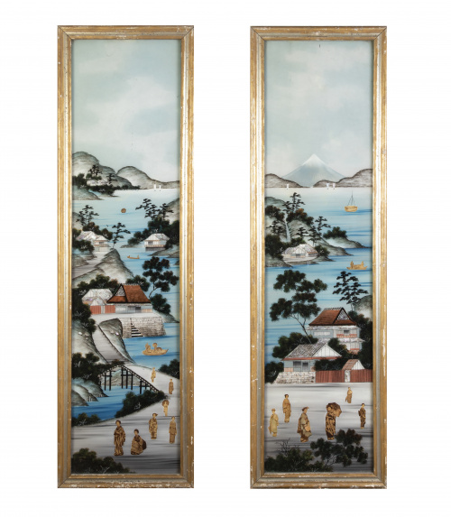 619. Pareja de cristales pintados bajo cristal con incrustación de nácar con paisajes de un puerto.