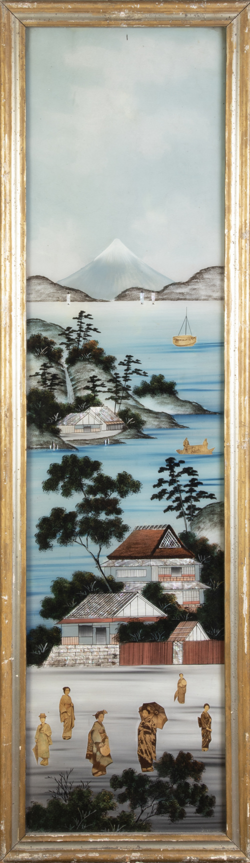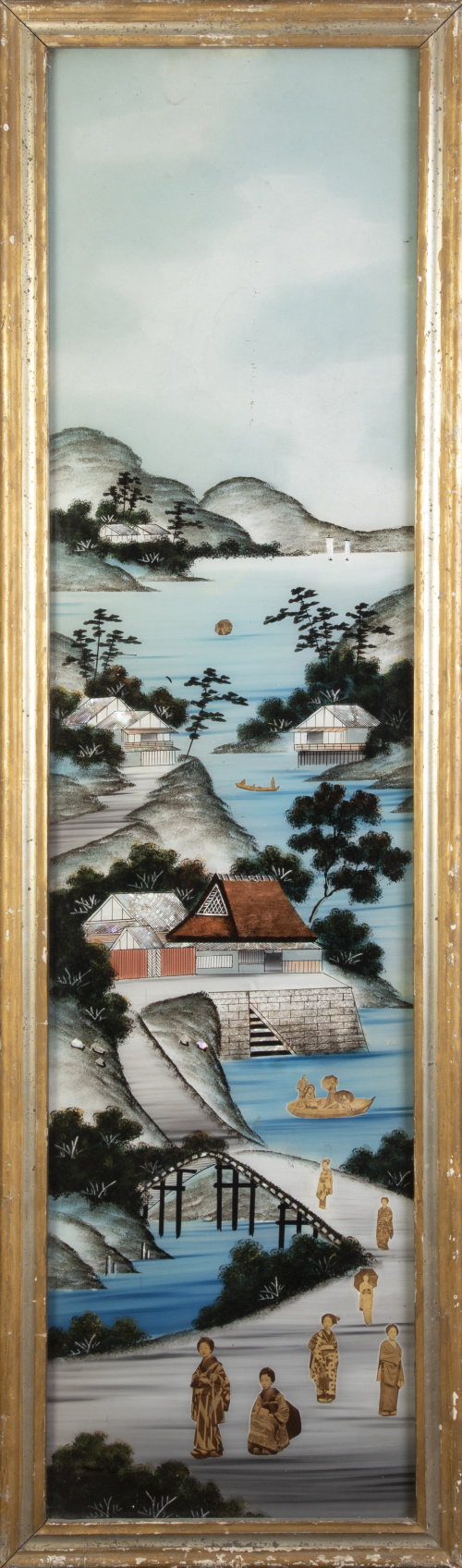 Pareja de cristales pintados bajo cristal con incrustación de nácar con paisajes de un puerto.