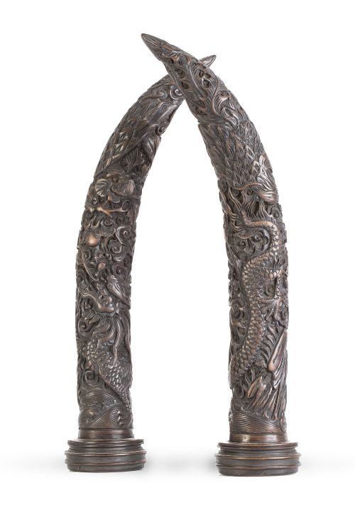 Pareja de "colmillos" de madera tallada con dragón y fénix