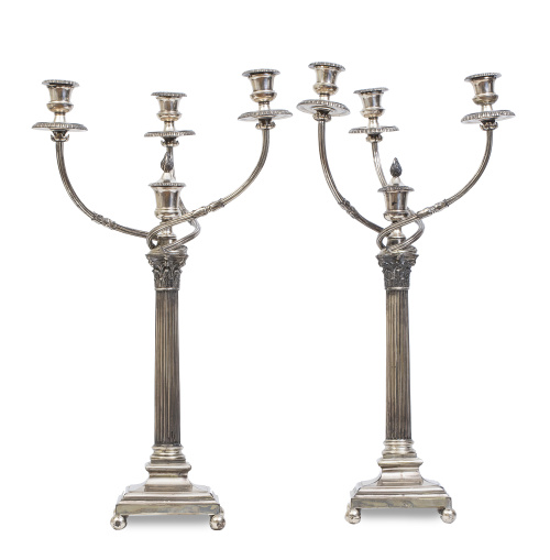 Pareja de candelabros de plata de estilo inglés, de tres brazos de luz. Ley 833.