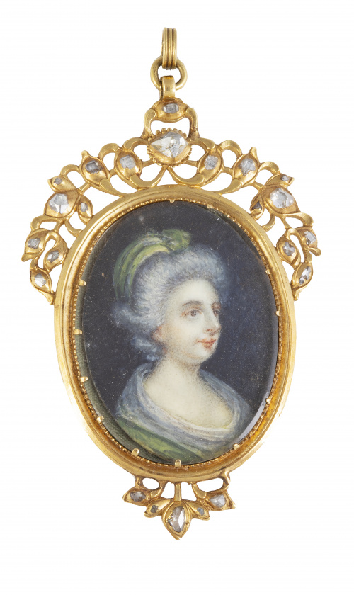 7. Colgante con miniatura de dama, S. XVIII, en marco de formas vegetales decoradas con diamantes de talla rosa y tabla