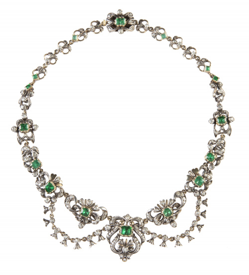 Home / SUBASTA JUNIO 2023 / Collar de estilo isabelino de esmeraldas y diamantes con di