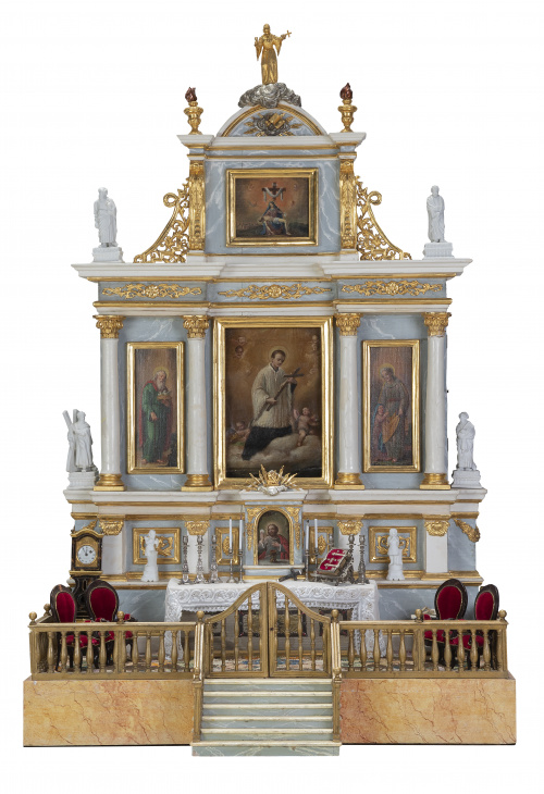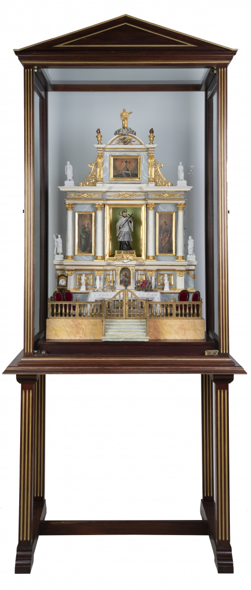 1179. Maqueta de retablo de madera tallada, estucada y dorada.