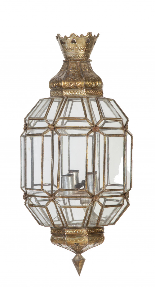 Home / SUBASTA JUNIO 2023 / Farol octogonal de techo de metal dorado y cristal.España