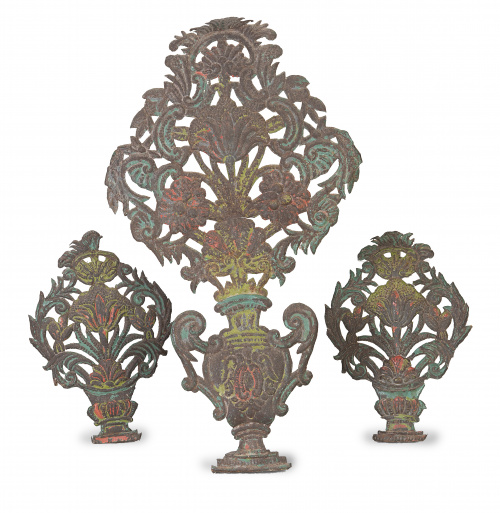 Juego de tres exvotos Carlos IV de latón con restos de policromía, con forma de jarrones.