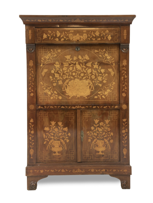 1312. Bureau á abattant de madera de caoba con marquetería de flores en limoncillo.